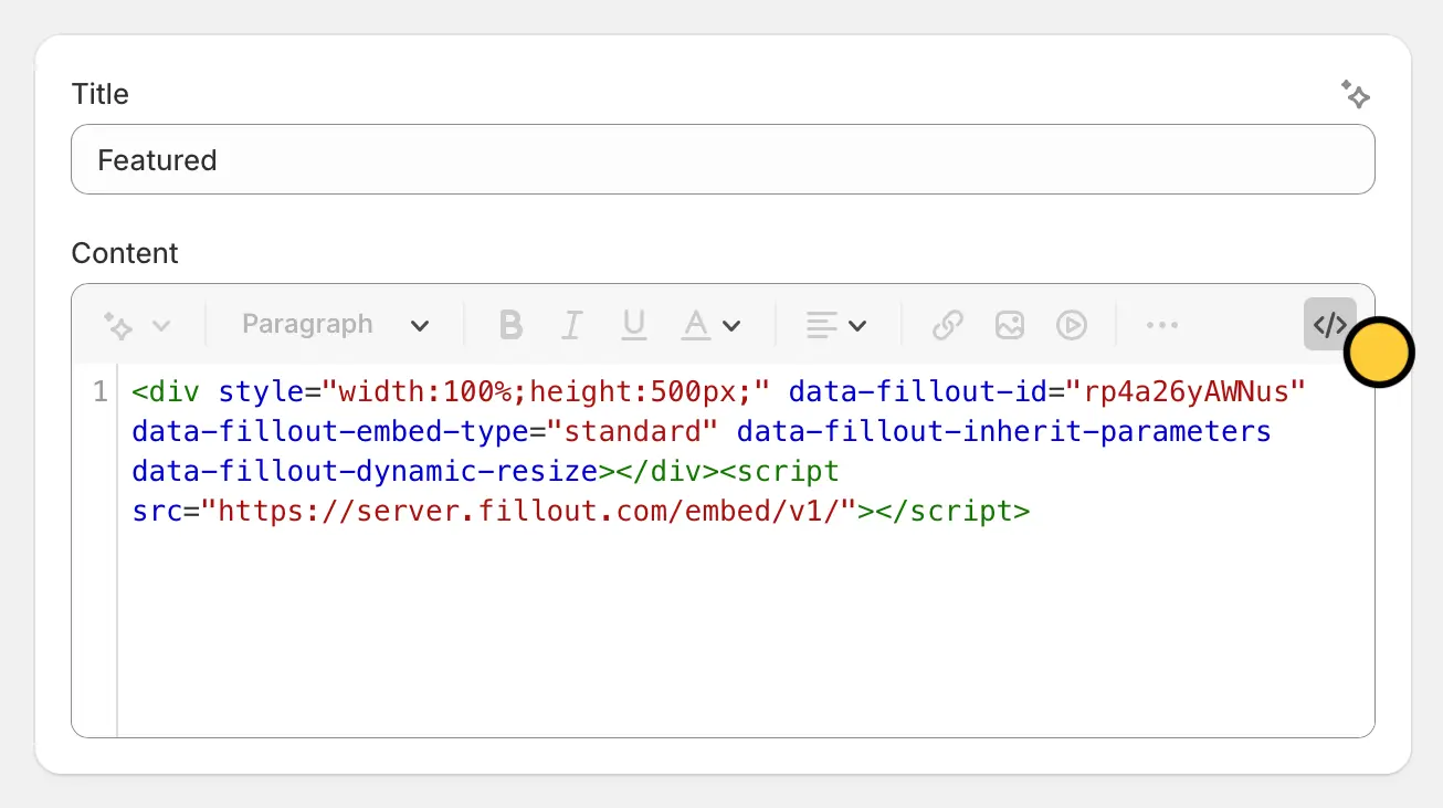 </> theme.liquid from the left-hand panel and paste the embed code of your Fillout form at the top of </body> and </html> tags at the bottom. Then, click Save in the top right.
